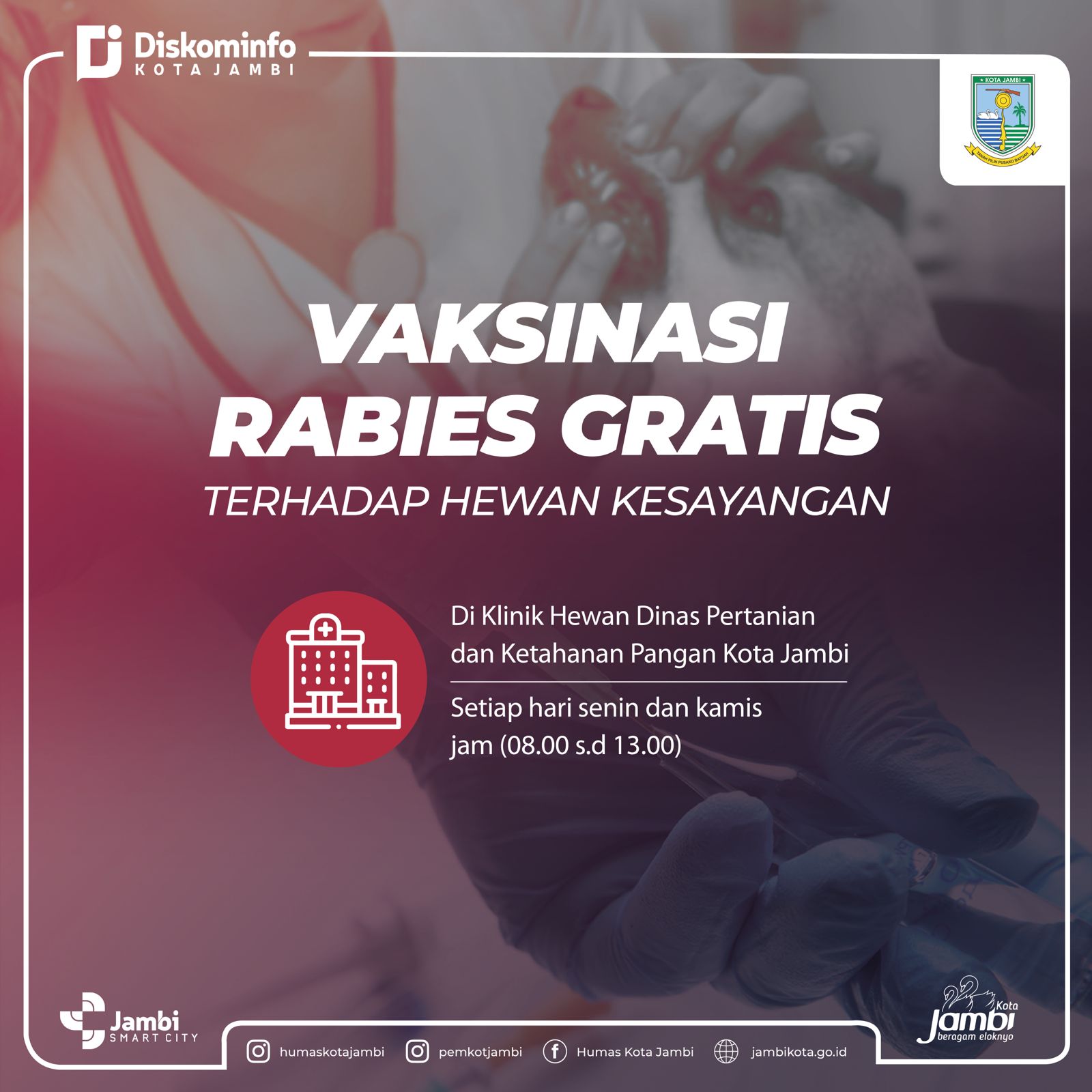 “Pastikan hewan peliharaan dirumah telah divaksinasi, minimal satu tahun sekali. Jika belum, segera bawa ke klinik kewan Dinas Pertanian dan Ketahanan Pangan Kota Jambi, bertempat di Jalan Pattimura Simpang Rimbo. Klinik melayani vaksinasi setiap hari Senin hingga Kamis, jam 08.00 s.d. 11.30 WIB. Layanan ini gratis, tidak dipungut biaya,” ujarnya.