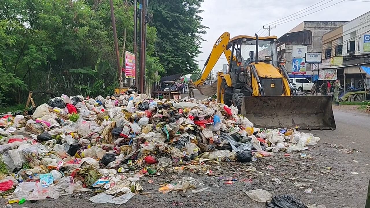 Tampak alat berat itu, menggeser sampah yang hampir memenuhi badan jalan.