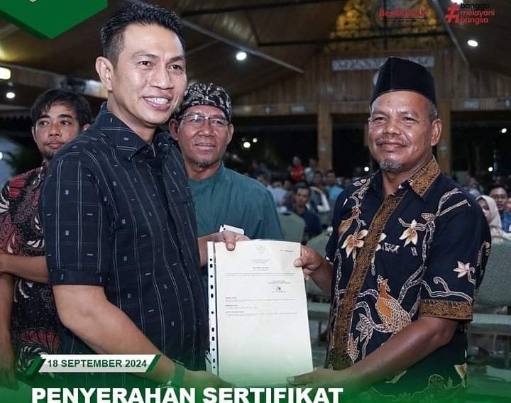 Cicitvjambi.com Bupati Batanghari, Muhammad Fadhil Arief menyerahkan 618 persil Sertifikat Pendaftaran Tanah Sistematis Lengkap (PTSL) Kabupaten Batanghari Tahun 2024 secara simbolis di Serambi rumah dinas Bupati Batanghari, Rabu (18/9/2024).