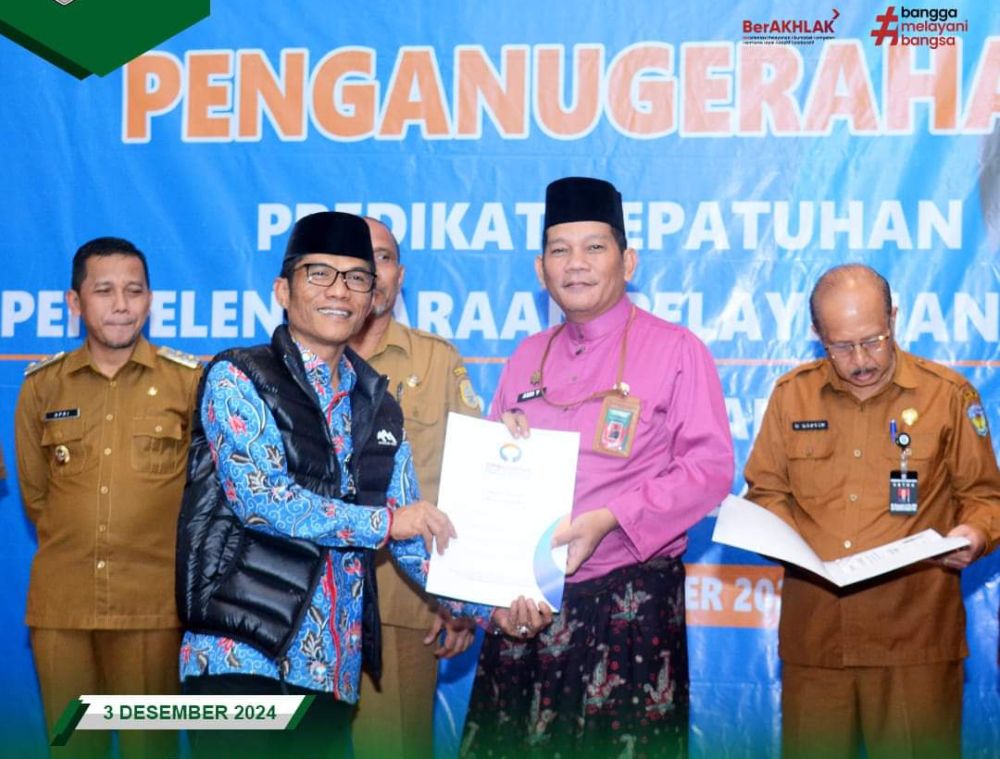 Anugrah kepatuhan penyelenggaraan pelayanan publik dari Ombudsman RI Perwakilan Jambi tersebut diterima oleh Asisten III Setda Batanghari, Asri Yonalsah di Kota Jambi, Selasa (3/12/2024).