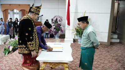 Acara ini menjadi momen penting dalam pergantian kepemimpinan dari Penjabat (Pj) Bupati Jangcik Mohza kepada pasangan Bupati dan Wakil Bupati terpilih, H. M Syukur dan Drs. H. Abdul Khafied Moein.