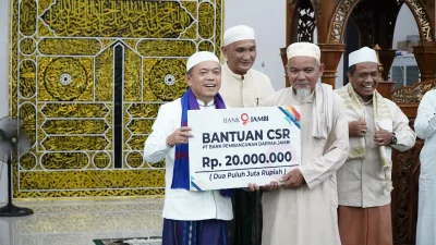 Dana pembangunan masjid yang disalurkan terdiri dari bantuan Corporate Social Responsibility (CSR) Bank 9 Jambi sebesar Rp20.000.000 serta hibah senilai Rp25.000.000.