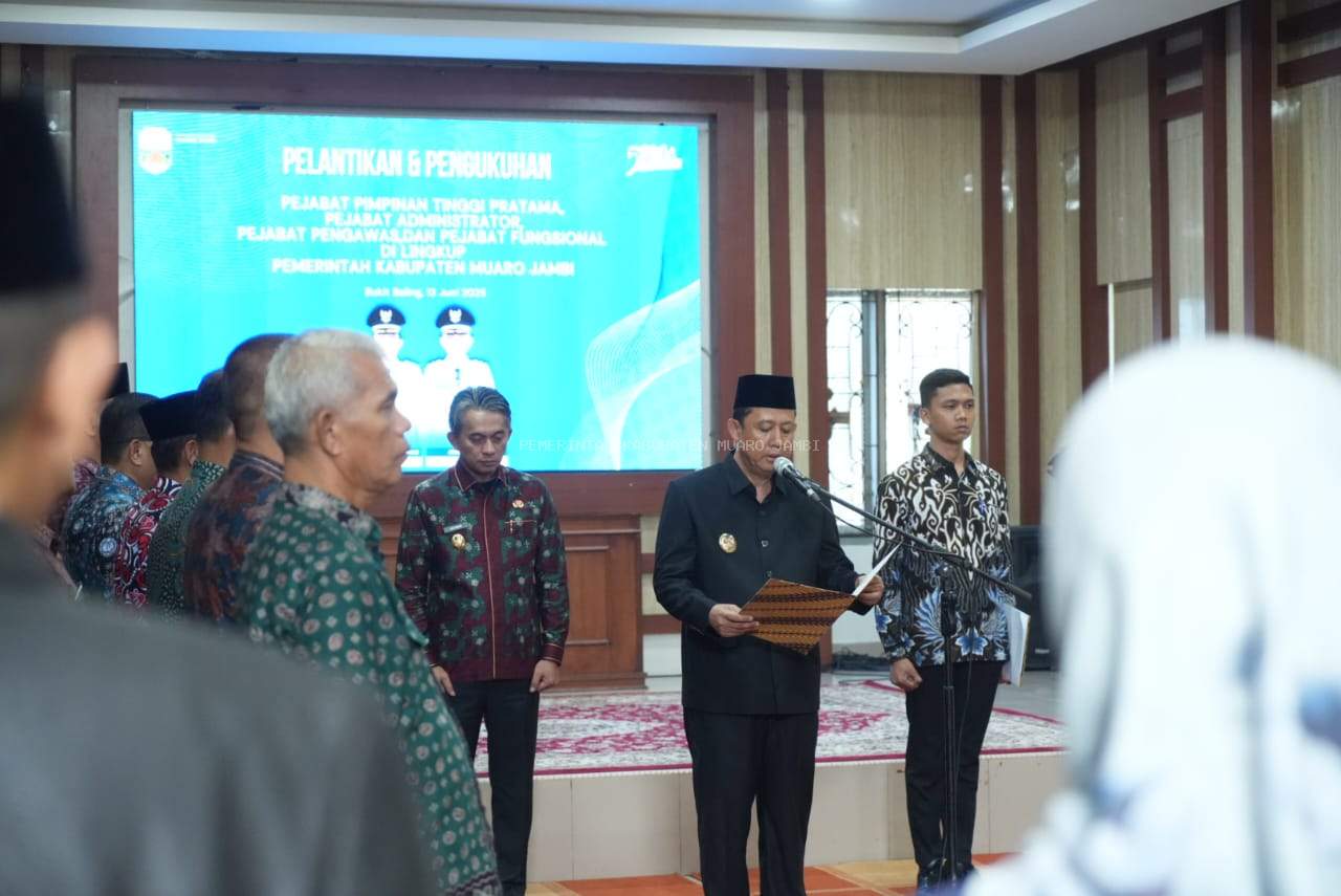 CiciTvJambi.Com – Bupati Kabupaten Muaro Jambi Bambang Bayu Suseno ( BBS) resmi melantik pejabat pimpinan tinggi pratama, pejabat administrator, pejabat pengawasan dan pejabat fungsional lingkup pemerintah kabupaten Muaro jambi, 56 Pejabat Pimpinan Tinggi Pratama (Eselon II , Esolan III dan IV) di lingkungan Pemerintah Kabupaten Muaro Jambi ,Di aula Rumah Dinas Bupati Jumat sore (13/6/2025).