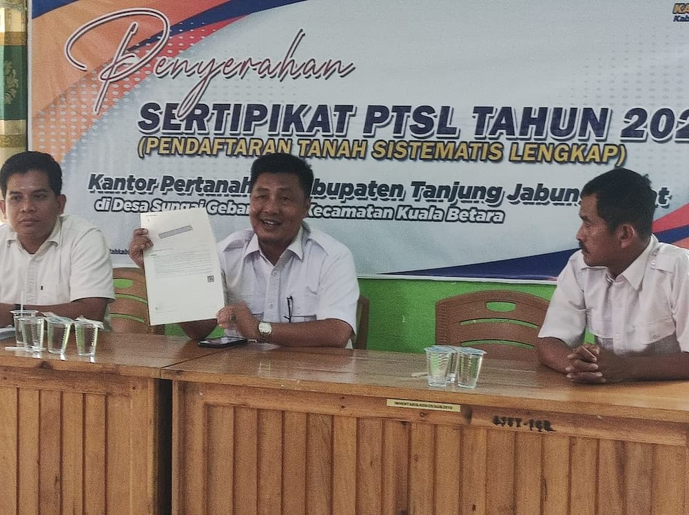 CiciTvJambi.com, Tanjung Jabung Barat – Kantor Pertanahan Kabupaten Tanjung Jabung Barat menyerahkan sertipikat Program Pendaftaran Tanah Sistematis Lengkap (PTSL) kepada warga Desa Sungai Gebar Barat, Rabu, 10 Desember 2025. Penyerahan ini menjadi langkah penting dalam memberikan kepastian hukum atas hak kepemilikan tanah masyarakat.
