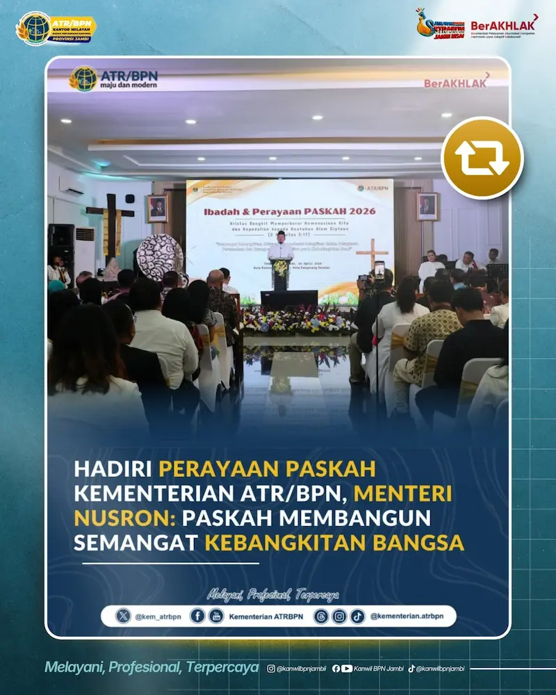 CiciTvJambi.com, Tangerang Selatan — Menteri Agraria dan Tata Ruang/Kepala Badan Pertanahan Nasional, Nusron Wahid, mengajak seluruh jajaran menjadikan momentum Paskah sebagai semangat kebangkitan bangsa, tidak hanya dalam dimensi spiritual, tetapi juga dalam kehidupan bernegara dan pelayanan publik.